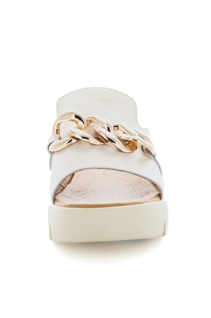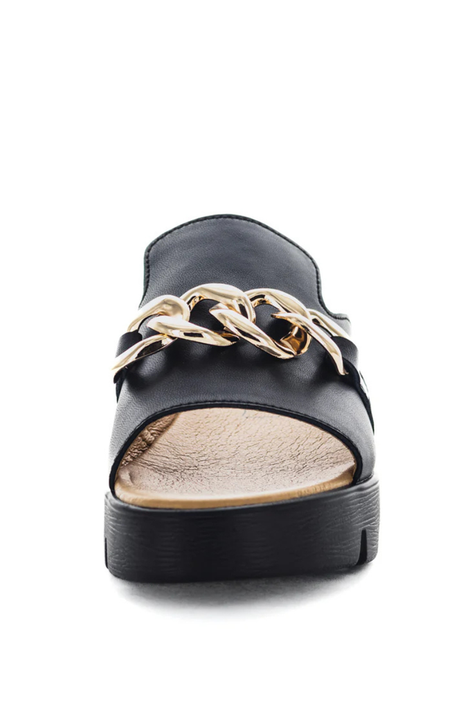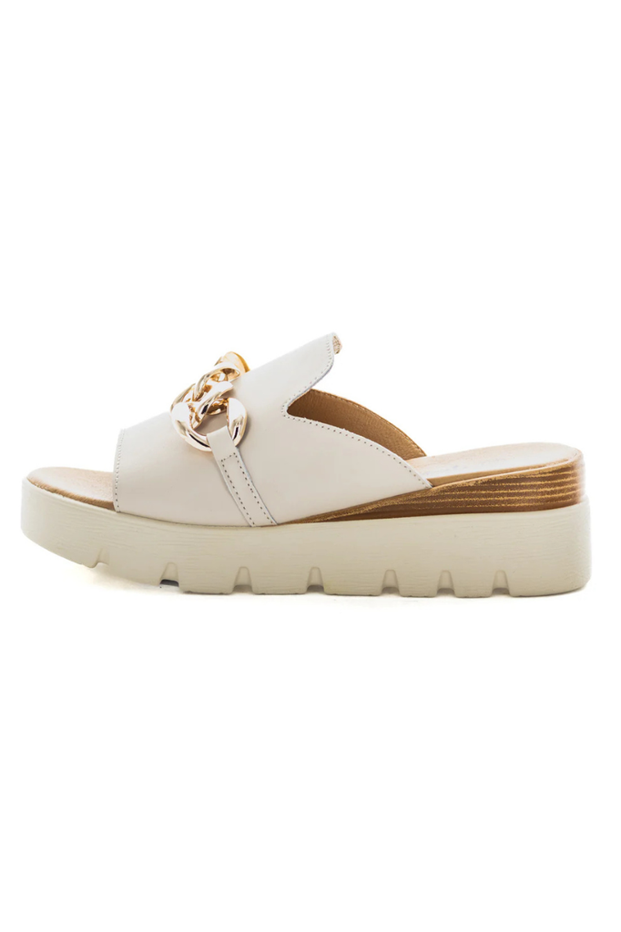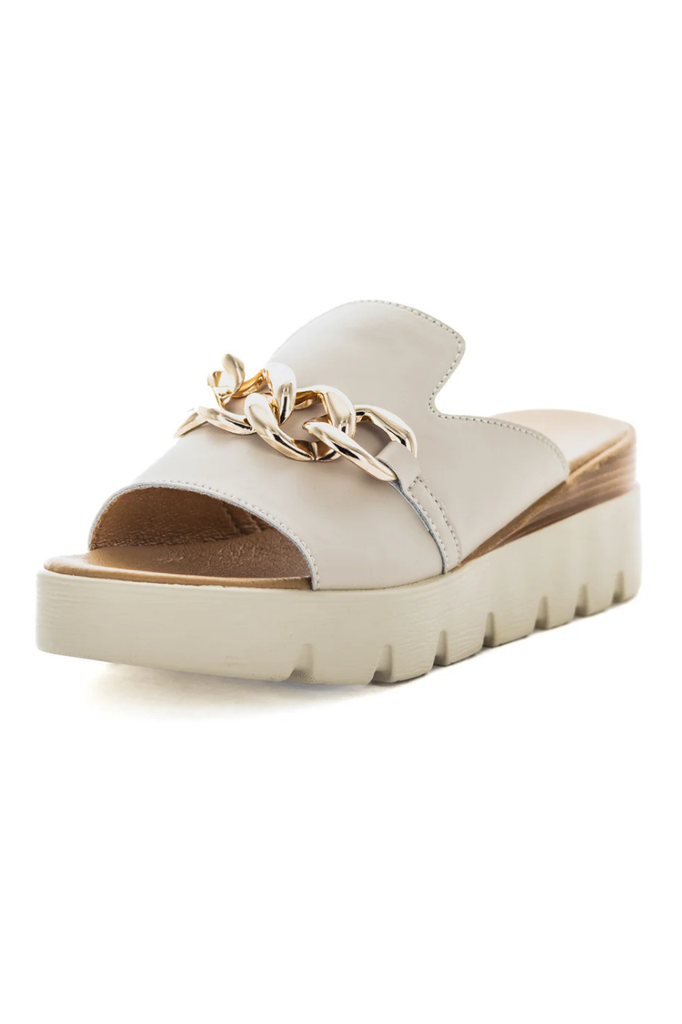 The Camara Slide combines style and comfort with a one-strap leather upper featuring a trendy decorative chain. The padded sock enhances cushioning for all-day wear, while the lightweight and durable construction ensures long-lasting support. A 50mm wedge platform adds subtle height without compromising stability, making these sandals a sophisticated choice for modern fashion.