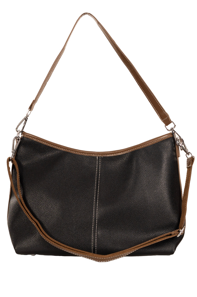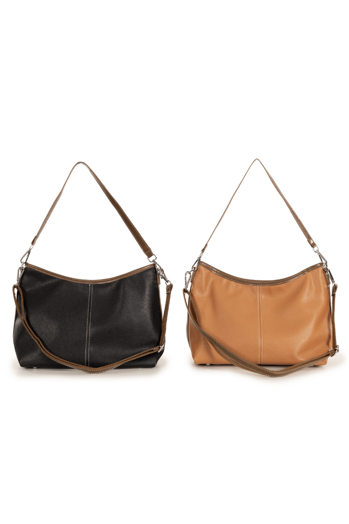 Vegan Leather Internal Features: Lined throughout in cream, Cyra has an internal pocket divider. One smaller zip pocket and one open pocket. External Features: The gentle pebble fabric in front is accentuated with two lines of highlight stitching.