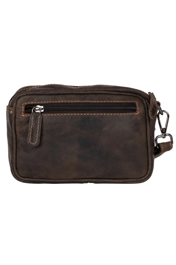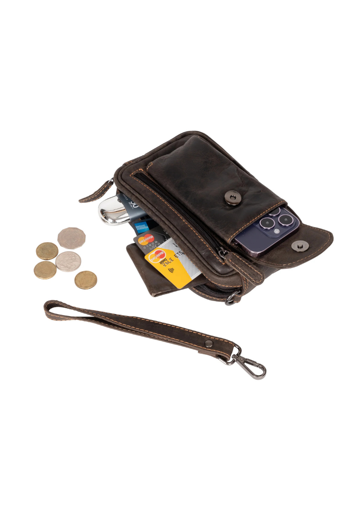 The Greenwood Leather wrist bag for men convinces with a sophisticated composition of high-quality workmanship and sophisticated design. The clear structuring of the compact outer shape is consistently continued in the design of the interior. The trendy used look expressively reflects natural origins. The spacious interior offers space for all necessary accessories. In a large main and additional zip compartments, which are equipped with solid zippers and leather cords can accommodate a wallet, mobile phone or digital camera, and a navigation device. Another mobile phone can be securely stowed in an additional attached pocket with magnetic closure in the front area. The sturdy hand strap with a metal carabiner is a comfortable way to carry the attractive leather men's bag.
